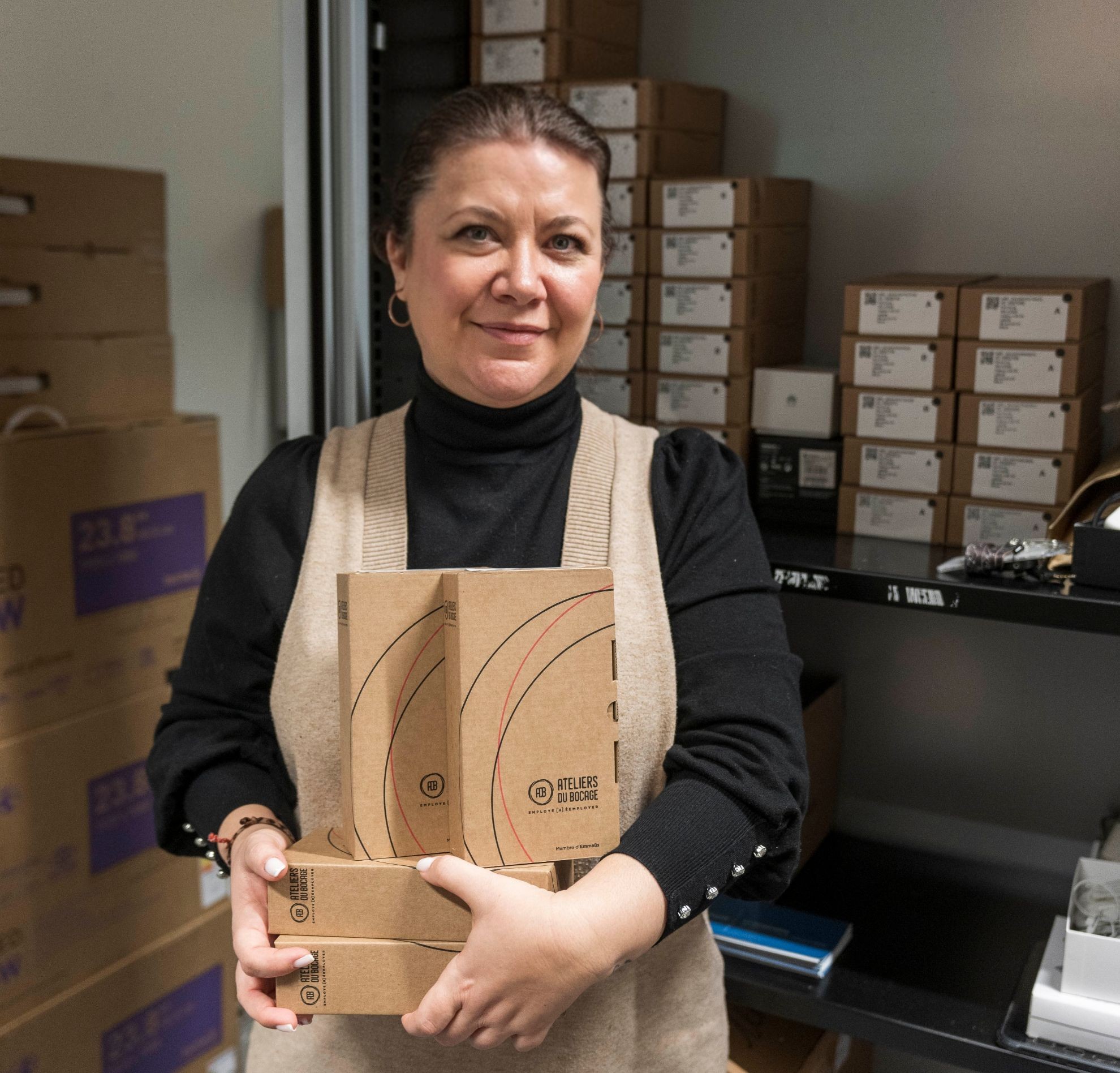 Photo : Nadège COELHO présentant une commande de smartphones reconditionnés par les Ateliers du Bocage.