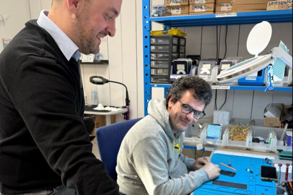 Romain (à gauche), technicien-vendeur à notre boutique informatique et smartphones reconditionnés à Cholet, a accueilli Martin (à droite), de l’ESAT Arc-en-Ciel de Cholet.