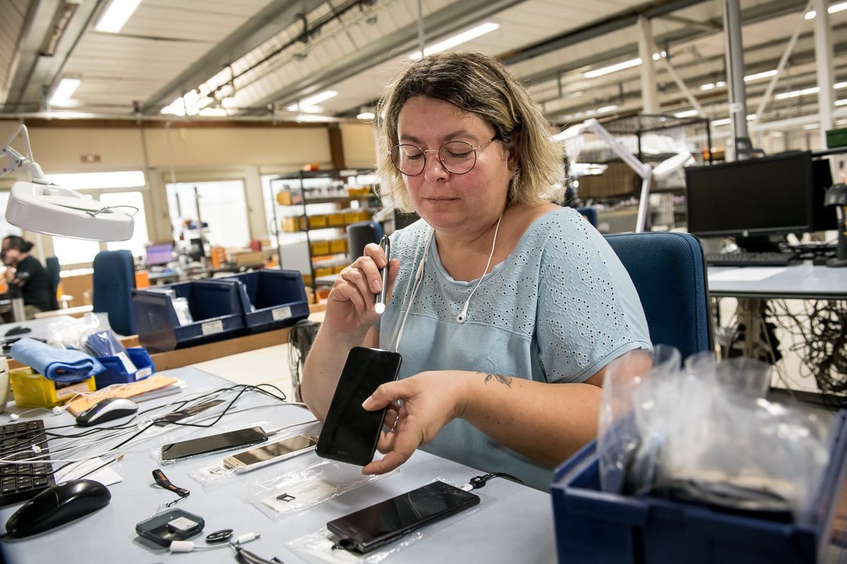 Photo : Nadège COELHO présentant une commande de smartphones reconditionnés par les Ateliers du Bocage.